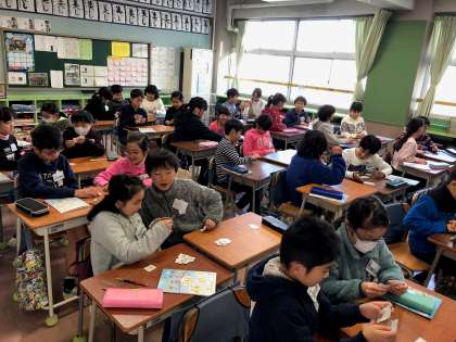 1/21 4年 外国語活動 公開日 2020/01/21 更新日 2020/01/21 学年 4年生の外国語活動では、学校の各教室を英語で話したり、自分の好きな場所を英語で話したりする活動を行っています。 下の写真は、カードを使いながらゲームすることを通して、「I like 〜」の表現に慣れ親しんでいる様子です。