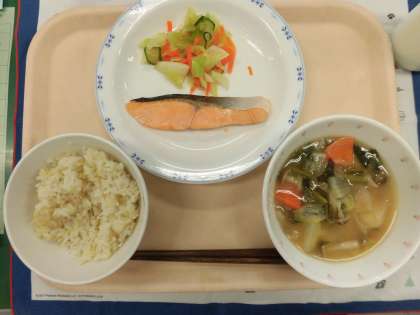 戦後、学校給食が再開されたのを記念して、1月24日〜30日が、「全国学校給食週間」となりました。全国学校給食週間1日目の今日の給食は、「昔の給食メニュー」です。今日の献立は昔、給食が始まった時の献立を再現してみました。そこでクイズです。給食を初めて食べたのは、どこの学校でしょうか?