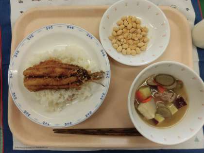 今日の給食は、節分献立です。そこで今日は、「節分」のクイズを出したいと思います。節分の日には、ある魚の頭をひいらぎの枝にさして、家の入り口に飾ります。さて、その魚とは次のうちのどれでしょうか?
