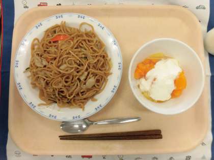 今日の給食は、「塩焼きそば」です。給食の焼きそばには、野菜がたくさん入っているので、栄養満点です。そこでクイズです。今日の焼きそばには、何種類の野菜が入っているでしょうか?