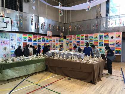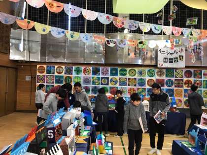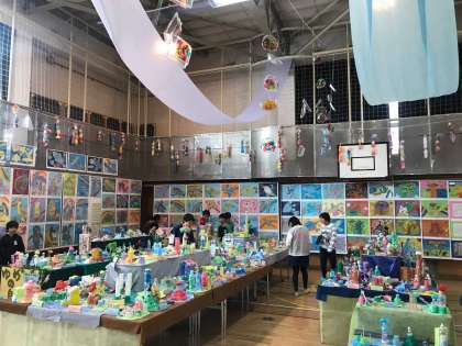 6年生の出展作品は、図工平面「イニシャルサークル」「墨の絵」、立体「未来をのぞく箱」家庭科「クッション」「ガーランド」そして、5年生との共同作品「壁画」です。その他にもガーランドやキラキラなど様々なところで作品作りに関わってきました。
