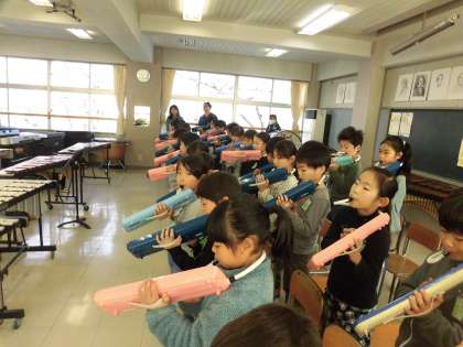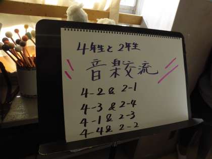 2年生も、お礼として「踊るポンポコリン」「赤い屋根の家」を演奏しました。合奏、合唱とお返しすることで、音楽交流会は大成功。2年生は、4年生のような合奏を目指して、日々の音楽を大切にしていきます。