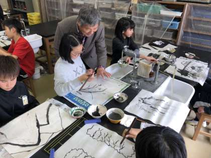 2月12日、13日に2回目の水ぼく画の授業がありました。前回学んだ筆の使い方や濃淡の出し方を思い出しながら、ひとつの作品を仕上げました。