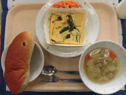毎月19日は、食育の日です。食育の日には、「給食で世界を飛び回ろう!〜東京オリンピック・パラリンピックに向けて、世界各国の料理に触れよう〜」ということで、いろいろな国の料理を出しています。そこでクイズです。今日の献立は、どこの国の料理でしょうか?