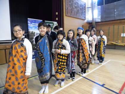 民族布の説明の際には、各クラスの代表児童が布を身にまとってファッションショーを行いました。