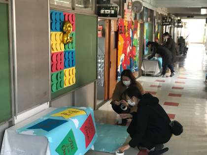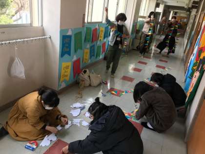 2/28の体育館装飾に加えて、新たにフラッグや雲のガーランドも作成。寂しかった3階廊下が一気に華やかになりました。