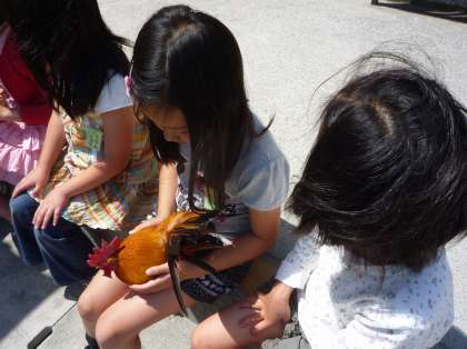 今日の休み時間は飼育委員会がおこなう「チャボとミルクに触れ合おう!」でした。このイベントは飼育委員会の子どもの発想ですが、1・2年生には大好評です。今いるチャボのうち2羽は用賀小学校で生まれて育ったチャボですから可愛いものです。