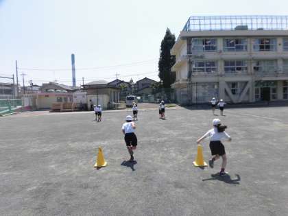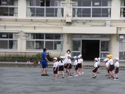 授業では水分補給を合間に入れながらの集団行動(気をつけ、休め、前へならえ)と、体をほぐす運動、走る運動をしました。利き足の確認と、それを使いながらのスタート、短い距離のダッシュです。