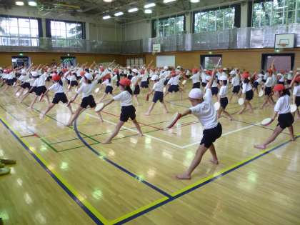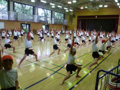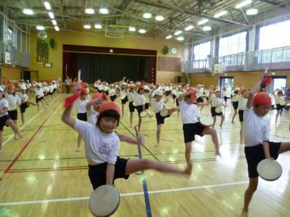 6/2 運動会練習〜3年生の真剣さ〜 公開日 2011/06/03 更新日 2011/06/02 校長室より 今日の運動会練習は雨のため体育館での練習です。3年生の表現は沖縄の伝統芸能「エイサー」です。足の動きが複雑で、体をひねる、回転するといった、3年生には難しい動きとリズムですが、曲に合わせて一人一人が真剣に精一杯がんばっています。運動会当日の演技を楽しみにしていてください。