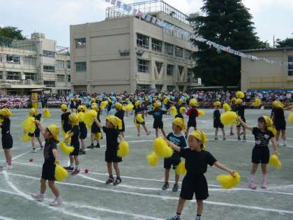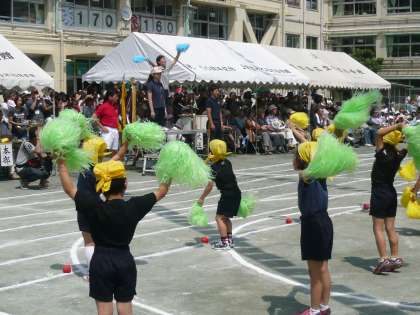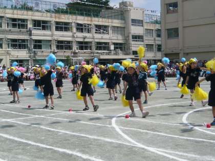 ひょっこりひょうたん島(1年生) 元気いっぱいにおどりました。 色違いのボンボンが可愛らしい!
