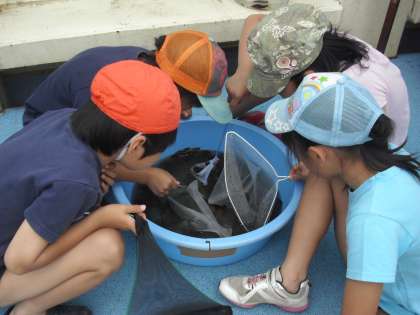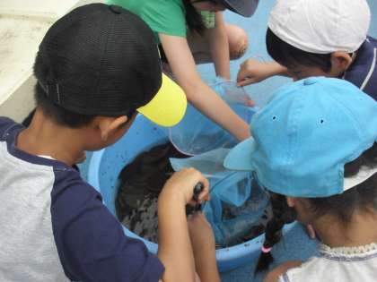子どもたちの安全を考慮し、教師がプールに入り、すくった水を大きなバケツに入れ、そのバケツから子どもたちは小さな網でヤゴをすくいました。