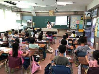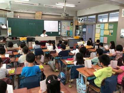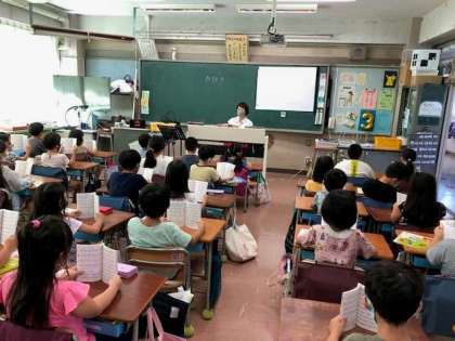 始業式から1週間。今日から音楽の授業も本格的に始まりました。講師の先生と学ぶ今日は、歌の響きについての話から。頭の上に響くような発声練習をしたり、お腹を意識した練習をしたりしました。歌を歌うのはもちろんですが、後半ではリズムの復習や、2学期から始まる鍵盤の予習を行うこともしました。