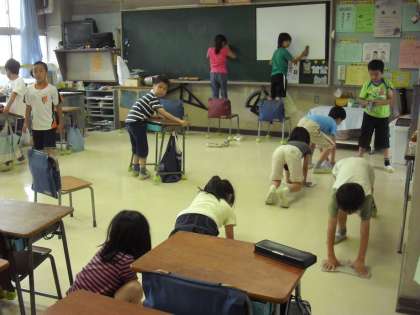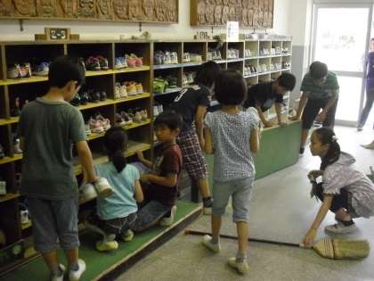 運動会が終わり学習や清掃に集中しています。現在、自問清掃は2年生以上の子どもたちが取り組んでいますが、教室内はシーンとしていておしゃべりがありません。高学年はもちろんですが、2〜4年生の子どもたちがとってもよくがんばっています。教室のみではなく、下駄箱掃除も毎日、全ての靴を出し、小ぼうきで掃き、靴の踵をきちんとそろえて入れています。見ていてとっても気持ちがよくなります。床を磨いたり、靴をきちんと整えたりしながら、自らの心を磨いています。