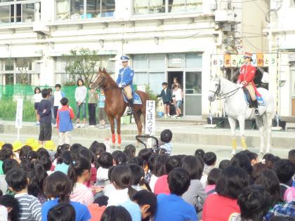 用賀小学校には、毎朝天気のよい日には、お馬さんが来てくれます。