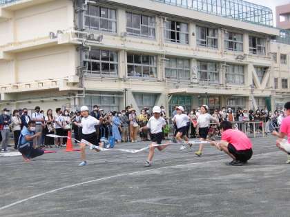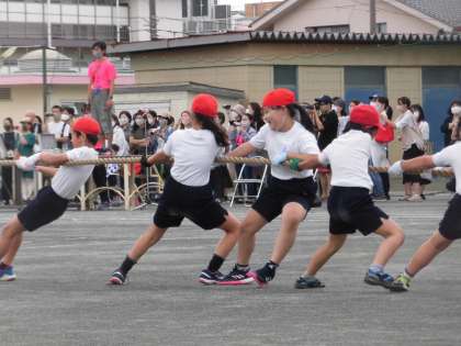 3年生は、「80m走」と「お助け綱引き」を行いました。「80m走」では、初めてカーブを走り、腕を大きく振って走る姿が見られました。また、「お助け綱引き」では、声を掛け合いながら、力強く取り組んでいました。