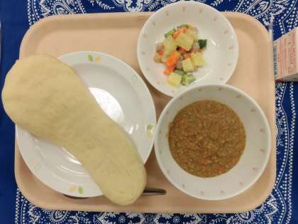 10/2 本日の給食 公開日 2020/10/02 更新日 2020/10/02 給食 〜今日の献立〜 ナン 牛乳 キーマカレー ひよこ豆入りポテトサラダ 〜給食メモ〜 今日は、「キーマカレー」のクイズを出したいと思います。キーマカレーの「キーマ」はインドの言葉で、何という意味でしょうか? 1. ひき肉 2. 黄色 3. 辛い ※クイズのこたえは、「食材がとれたところ…」の最後にのせています。 食材がとれたところ・・・ 閉じる 食材がとれたところ… じゃがいも…北海道 豚肉…青森県 鶏肉…青森県 にんにく…青森県 しょうが…高知県 セロリー…長野県 きゅうり…長野県 にんじん…北海道 たまねぎ…北海道 黄ピーマン…山形県 クイズのこたえは、1の「ひき肉」です。キーマカレーには、ひき肉やみじん切りにした野菜を使います。ひき肉には体を作ってくれる「たんぱく質」、野菜にはおなかの中をきれいにしてくれる「食物繊維」がたくさん入っています。残さず食べましょう。