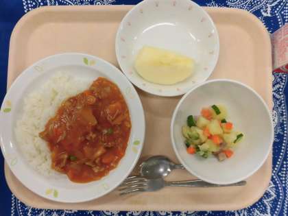 10/7 本日の給食 公開日 2020/10/07 更新日 2020/10/07 給食 〜今日の献立〜 ハヤシライス 牛乳 ポテトサラダ くだもの(りんご) 〜給食メモ〜 今日のくだものは、今が旬の「りんご」です。そこで今日は、「りんご」のクイズを出したいと思います。日本で、いちばんりんごを作っているのはどこでしょうか? 1. 北海道 2. 青森県 3. 長野県 ※クイズのこたえは、「食材がとれたところ…」の最後にのせています。 食材がとれたところ・・・ 閉じる 食材がとれたところ… 米…埼玉県 じゃがいも…北海道 豚肉…青森県 たまねぎ…北海道 にんじん…北海道 しめじ…新潟県 きゅうり…群馬県 りんご…山形県 クイズのこたえは、2の「青森県」です。今日の給食のりんごは、山形県で作られたものです。「1日1個のりんごは医者を遠ざける」ということわざがあるほど、りんごは栄養いっぱいの食べものです。今日も残さず食べましょう。