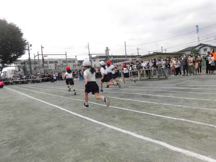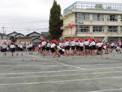 「玉入れ」」では、玉入れの前のダンスを1年生らしく元気いっぱいに踊りました。また、玉が入るように高く投げたり、競技中の隊形移動を間違えないように頑張りました。