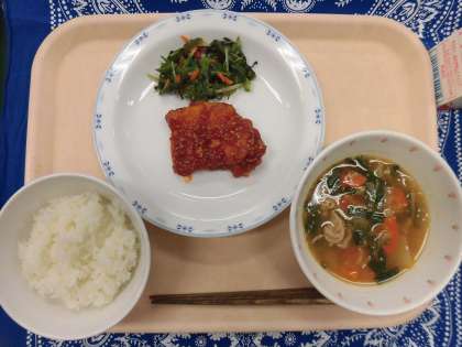 毎月19日は、食育の日です。食育の日には、「給食で世界を飛び回ろう!〜東京オリンピックに向けて、世界各国の料理に触れよう〜」ということで、いろいろな国の料理を出しています。クイズです。今日の献立は、どこの国の料理でしょうか?