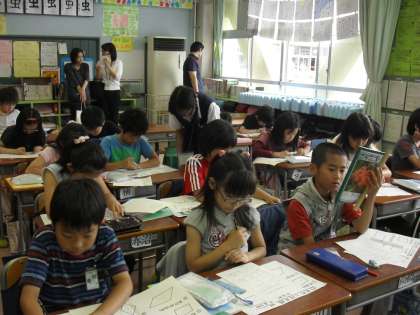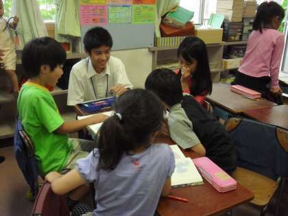 学校公開初日の土曜日に、用賀中学校の2年生9名がリトルティーチャーとして、3、4時間目に教室に入り、先生の授業のお手伝いをしました。世田谷9年教育小中連携事業の一つとして、初めての試みでした。やる気いっぱいで来てくれた中学生も、多くの保護者の方々を前に緊張した面持ちでした。先生の授業に集中している子どもたちに声をかけることはなかなか勇気がいることですが、目線を小学生に合わせて笑顔でアドバイスを送る姿も見られるようになりました。