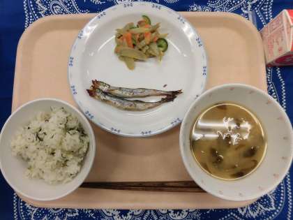 11/6 本日の給食 公開日 2020/11/06 更新日 2020/11/06 給食 〜今日の献立〜 青菜めし ししゃもの香味焼き 牛乳 ごぼうのカレーマヨあえ じゃがいものみそ汁 〜給食メモ〜 11月8日は、「いい歯の日」です。いい歯をつくるためには、よく噛んで食べることが大切です。そこでクイズです。一口、何回かむとよいと言われているでしょうか? 1. 5回 2. 10回 3. 30回 ※クイズのこたえは、「食材がとれたところ…」の最後にのせています。 食材がとれたところ・・・ 閉じる 食材がとれたところ… 米…埼玉県 じゃがいも…北海道 しょうが…高知県 にんにく…青森県 きゅうり…埼玉県 ごぼう…青森県 にんじん…北海道 たまねぎ…北海道 こまつな…東京都 わかめ…熊本県 クイズのこたえは、3の「30回」です。よくかむと、だ液がたくさん出るので、むし歯を予防してくれます。今日は、カルシウムたっぷりの「青菜めし」と「ししゃもの香味焼き」を作りました。一口30回を目標に、しっかりかんで食べましょう。