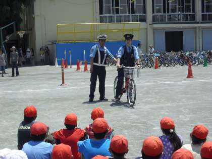 梅雨の晴れ間がのぞき、気温もぐんぐん上がりました。晴天の下、自転車教室を行いました。用賀小学校では、毎年3年生が自転車の正しい乗り方教室を行ないます。玉川警察署からは、2名の警察官の方と、馬事公苑にある駐在所からも1名来ていただいて、ていねいなご指導をいただきました。