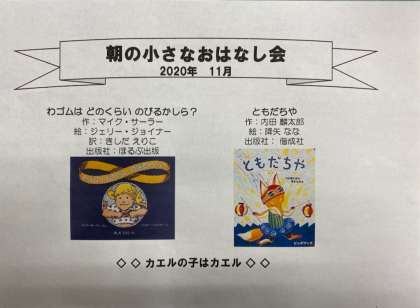 読んでいただいた本は、「わゴムは、どれくらい、のびるかしら?」と「ともだちや」です。短い時間の中でのお話会ではありましたが、子ども達は集中して聞くことができていました。