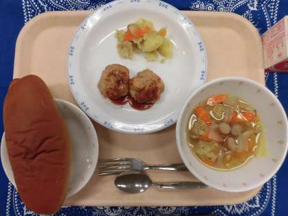 毎月19日は、食育の日です。食育の日には、「給食で世界を飛び回ろう!〜東京オリンピック・パラリンピックに向けて、世界各国の料理に触れよう〜」ということで、いろいろな国の料理を出しています。そこでクイズです。今日の献立は、どこの国の料理でしょうか?