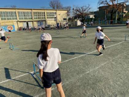 5年生は、「ハードル走」と「走り幅跳び」の学習をしています。「ハードル走」では、50メートルを全力で走ったときのタイムに近づけるように、練習に取り組んでいます。