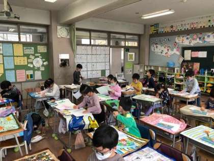 12/9 1年 図工「たまごの中から」その2 公開日 2020/12/09 更新日 2020/12/09 学年 前回の図工では、卵の殻を作りましたが、今回はそこから生まれる生き物をクレパスで描きました。実に様々な生き物を、それぞれ自由に描くことができました。