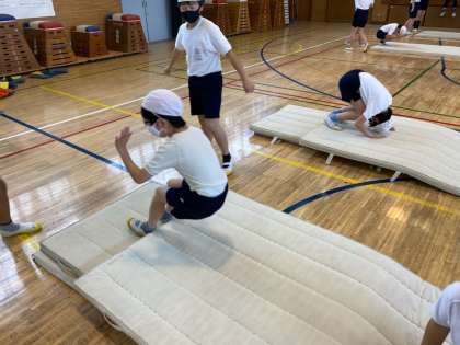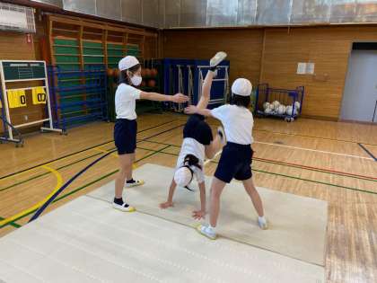 12/9 5年生体育「マット運動」 公開日 2020/12/10 更新日 2020/12/10 学年 5年生では、体育館体育でマット運動をしています。開脚後転や補助倒立など、それぞれが自分の課題をもって、練習に取り組んでいます。 友達とお互いの動きを見合って、アドバイスを送り、課題を達成する子も多くいました。