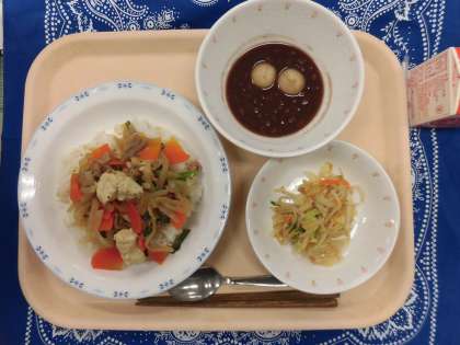 1/12 本日の給食 公開日 2021/01/12 更新日 2021/01/12 給食 〜今日の献立〜 すき焼き丼 牛乳 ピリ辛野菜 白玉しるこ 〜給食メモ〜 昨日、1月11日は、ある行事の日でした。さて、昨日は何の日だったでしょうか? 1. お正月 2. 七草 3. 鏡開き ※クイズのこたえは、「食材がとれたところ…」の最後にのせています。 食材がとれたところ・・・ 閉じる 食材がとれたところ… 米…埼玉県 豚肉…神奈川県 にんじん…千葉県 たまねぎ…北海道 ねぎ…千葉県 春菊…群馬県 もやし…栃木県 キャベツ…愛知県 きゅうり…埼玉県 クイズのこたえは、3の「鏡開き」です。鏡開きの日には、お正月にお供えしておいた鏡餅を食べ、今年も元気に過ごせるようにと願います。給食では、「白玉しるこ」を作りました。3学期も残さず食べて元気に過ごしましょう。のどに詰まらせないように、少しずつよくかんで食べて下さいね。