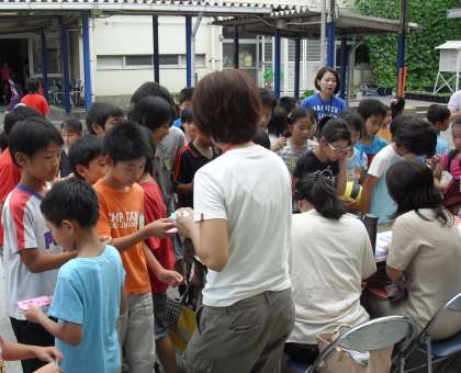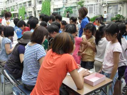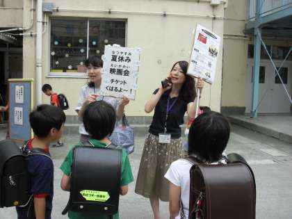 中休みになると、一気に子どもたちが並んでチケットをもらいに来ました。もらった子どもたちはとっても嬉しそうでした。映画会は7月21日、上用賀アートホールで開催されます。多くのご来場をお待ちしています。