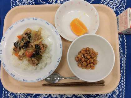 今日は、全国学校給食週間の6日目です。今日の献立は、「かみかみメニュー」です。そこで今日は、「大豆とじゃこの甘辛揚げ」の「大豆」のクイズを出したいと思います。大豆は、次のうちのどの食べ物が成長したものでしょうか?