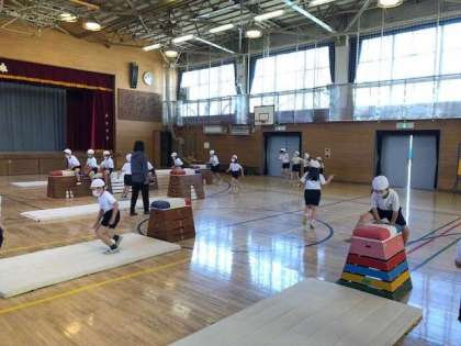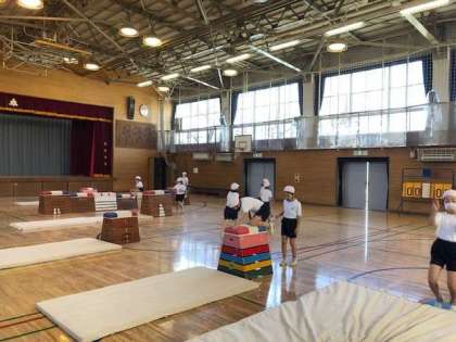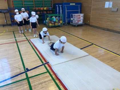 体育館体育では、跳び箱やマットを用いた運動遊びを行っています。