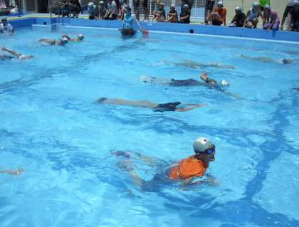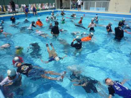 今日の6年生の水泳授業は着衣泳です。着衣したまま入水し、浮いたり泳いだりする学習をしました。実際に上着を着たり、ズボンをはいたり、靴のまま水に入ると重くて窮屈でとても動きにくくなってしまいます。もしもの時も、あわてずにゆっくり、力を抜いて浮きをとることがポイントです。上着のお腹の部分に空気を入れたり、いか泳ぎを習ったりして、浮きやすい技術を学びました。