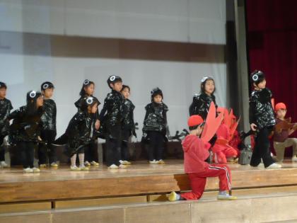 11/15 学芸会 その2 1年生 公開日 2008/11/15 更新日 2008/11/15 今日のできごと 1年生の劇は「ザリガニたんけんたい」です。教室で飼っているザリガニのお話です。ザリガニやいろいろな生き物の気持ちになって、精一杯演技をしました。