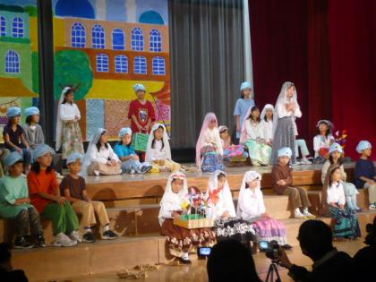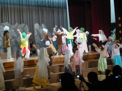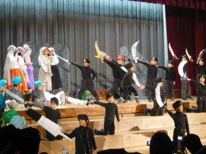 3年生は、「アイウエオリババ」です。昔、ペルシャの国に大泥棒がいました。姿がそっくりな5人の仲良し兄弟が取られた宝を町の人に奪い返します。有名な「ひらけごま」の呪文を唱えると、大岩が音と立てて開きます。164人の子どもたちが全員主役のつもりで演じました。
