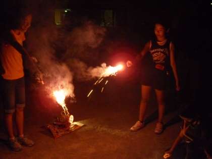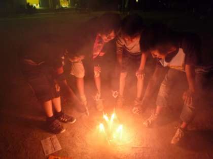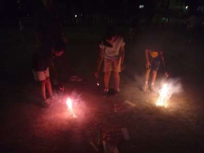 とっても怖い「肝試し」のあとには花火のプレゼントがまっていました。小さな花火ですが友達と一緒だと楽しさが倍増です。花火を見ながら、興奮した体の火照りを冷ましていきます。花火は中学生も一緒に参加しました。
