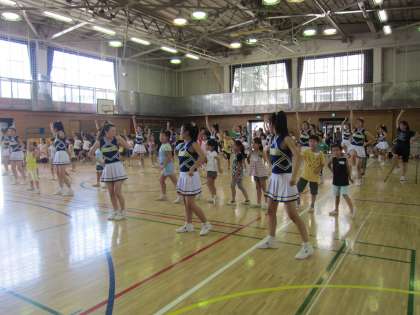 今日のスマイルスクールは「チアリーディング」です。駒澤大学高等学校チアリーディング部のみなさんが、野球の応援歌「タッチ」の曲に合わせたかわいらしく楽しい踊りを教えてくださいました。