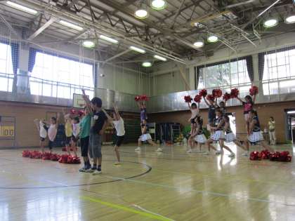 チアリーディング部の皆さんが実際に使っているポンポンを持って、笑顔いっぱい、元気いっぱいで踊ることができました。