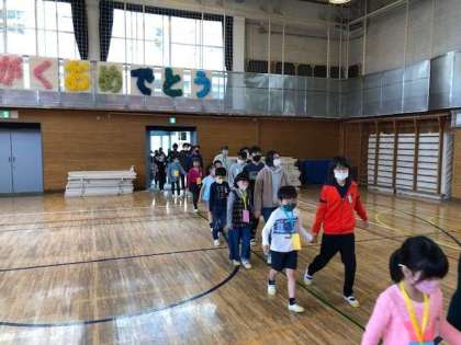 今日の3時間目に、1年生を迎える会がありました。6年生のエスコートで会場に入った1年生。きちんと列で座ることができました。