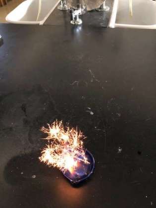 余った時間で、ちょこっと実験。普段燃えている炎の色はオレンジですが、少し変えてみました。青、緑、赤、最後はパチパチさせて、なぜこうなるのかのお話をして終わった科学クラブ。写真は最後のパチパチしているところですが、次回はどんな内容なのか、楽しみですね☆