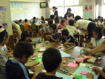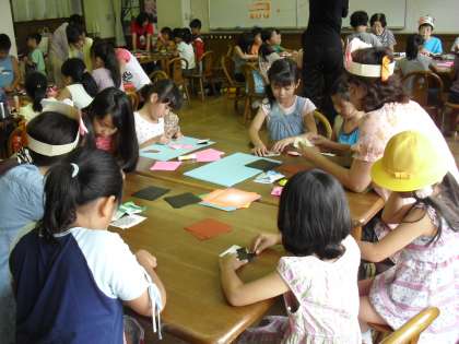 今日のスマイルスクールは、おりがみです。おりがみを使って、パンダ、うさぎ、さるを作りました。先生に教えていただいた折り方を友達とも教え、確かめ合ったりしながら、丁寧に折っていました。できた動物たちを色画用紙に貼ると、なかよく遊んでいるように見え、お話が思い浮かんできました。お家で、絵をかき加えたり、もっと折って仲間をふやしてみたりするのも素敵です。自分だけの動物の世界をぜひ、作ってみましょう。