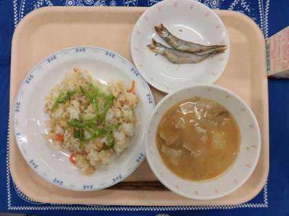 5/12 本日の給食 公開日 2021/05/12 更新日 2021/05/12 給食 〜今日の献立〜 子ぎつねごはん 牛乳 焼きししゃも 呉汁 〜給食メモ〜 今日は、「ししゃも」のクイズを出したいと思います。ししゃもには、どのくらいカルシウムが入っているでしょうか? 1.牛乳の半分 2.牛乳と同じ 3.牛乳の3倍 ※クイズのこたえは、「食材がとれたところ…」の最後にのせています。 食材がとれたところ・・・ 閉じる 食材がとれたところ… 米…埼玉県 鶏肉…青森県 豚肉…青森県 じゃがいも…鹿児島県 にんじん…徳島県 絹さや…徳島県 だいこん…千葉県 ごぼう…熊本県 ねぎ…千葉県 クイズのこたえは、3の「牛乳の3倍」です。ししゃもは、丸ごと骨まで食べることができるので、カルシウムをたくさんとることができます。小学生は骨が成長する時期なので、カルシウムをきちんととることが大切です。小魚や牛乳、チーズなどを上手に組み合わせて、カルシウムをとるように心がけましょう。
