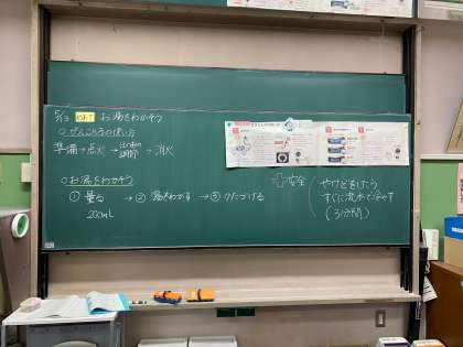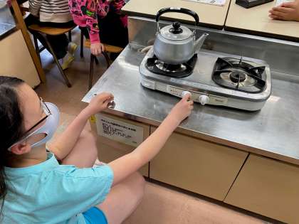 5/13 5年 家庭科「お湯をわかそう」 公開日 2021/05/14 更新日 2021/05/14 学年 本日、5年生の家庭科の学習でお湯を沸かす活動を行いました。 家庭科室のガスこんろは、毎回自分たちでガスの栓を開いて使います。 初めてゴム管を栓に取り付けたり、点火させたりしてやかんでお湯をわかしました。 時間内に安全に活動することができました。