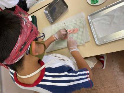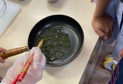 また、スクランブルエッグに見立てた寒天液を混ぜながら冷やし固める活動も行いました。