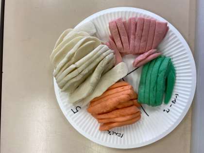 コロナ禍での実習のため実際の食材は使わず、小麦粉を水で練って着色した粘土のようなものを代用品として使用しました。にんじん、ピーマン、玉ねぎ、ハムに見立てたものをそれぞれ短冊切り、せん切り、うす切りにしました。