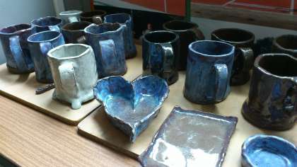 2回に渡って行った陶芸教室の作品が焼き上がりました。釉薬がいい具合に溶けていい色になりました。土に鉄が含まれているので、地が黒赤で、特に白や青がいい色が出ました。
