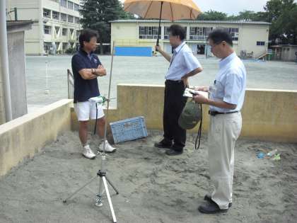 世田谷区教育委員会施設課の方が来校し、本校の校庭と砂場の放射線量を測定しました。私どもも立ち会いましたが、人体には影響のない平常の範囲内の数値でした。